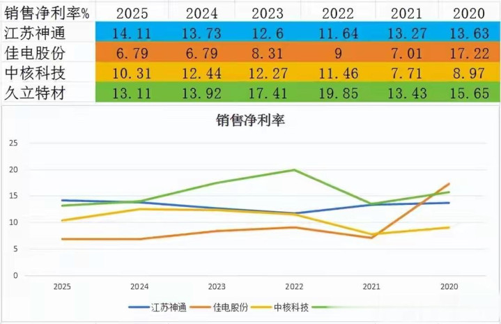 判断企业潜力,财务数据是重要参考,净资产收益率ROE能综合反映企业盈利、运营、杠杆水平,通过杜邦分析拆解三大指标,可清晰对比四家企业经营质量。数据基于2025年前三季度财报,销售净利率衡量盈利效率,江苏神通以14.11%位居第一,每百元收入能赚14元以上,久立特材、中核科技、佳电股份依次位列其后,盈利效率差距明显。
