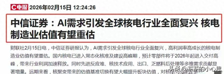 AI算力需求持续攀升,电力供应成为行业发展的核心瓶颈,核电凭借稳定、清洁、高效的特性,成为支撑AI产业发展的关键能源。2026年2月15日中信证券研报明确指出,全球核电行业迎来全面复兴,国内核电进入常态化核准与建设高峰期,核电零部件将在2026年起进入交付高峰,行业利润进入加速释放周期。核电零部件行业具备高资质、高技术、高客户的三重壁垒,头部企业将优先享受行业扩容红利,江苏神通、佳电股份、中核科技、久立特材作为细分领域龙头,是核电产业链中最具关注价值的标的。